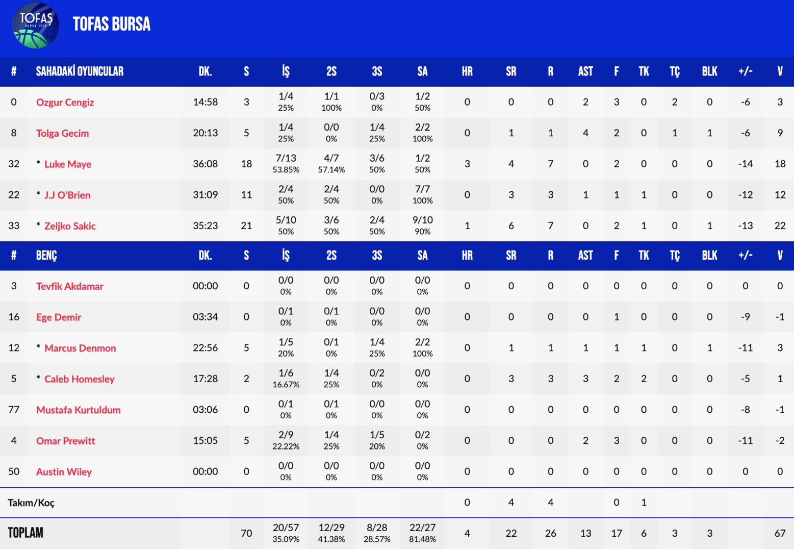 Malaga deplasmanında TOFAŞ'ta Zeljko Sakic 21 sayı; Luke Maye 18 sayı; J.J. O'Brien 11 sayıyla oynarken; gribal enfeksiyon geçiren Cassius Winston ile maç öncesinde dizinde ağrı hisseden Austin Wiley mücadelede forma giymedi.