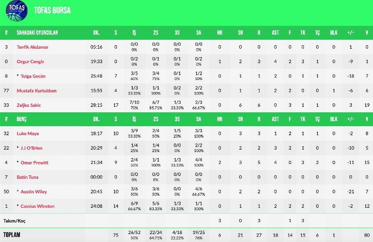 UCAM Murcia karşısında TOFAŞ'ta Zeljko Sakic 17 sayı; Cassius Winston 14 sayı; Austin Wiley ve Luke Maye de 10'ar sayıyla oynarken; Caleb Homesley ve Ege Demir ise sakatlıkları nedeniyle forma giymedi.