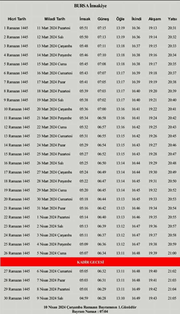BURSA RAMAZAN İMSAKİYESİ 2024