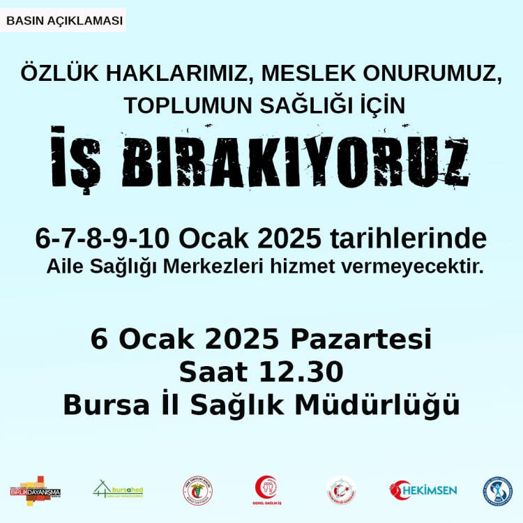 İş bırakacak aile hekimleri, 6 Ocak Pazartesi günü saat 12:30'da Bursa İl Sağlık Müdürlüğü önünde basın açıklaması yapacak.