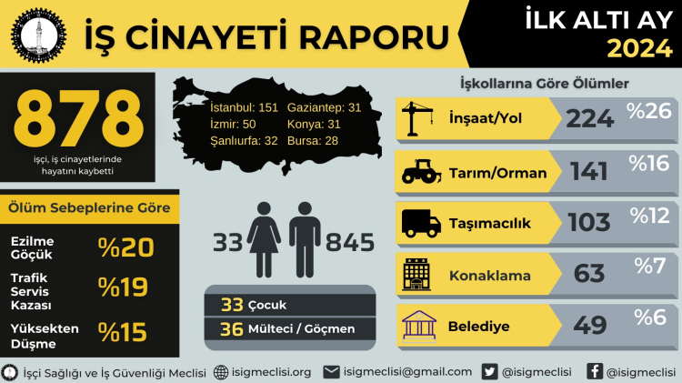 2024 yılının ilk altı ayındaki iş cinayetleri raporunu açıklayan İSİG Meclisi, "Yüzde 71’ini ulusal basından; yüzde 29’unu ise işçilerin mesai arkadaşları, aileleri, iş güvenliği uzmanları, işyeri hekimleri, sendikalar ve yerel basından öğrendiğimiz bilgilere dayanarak tespit ettiğimiz kadarıyla 2024 yılının ilk altı ayında en az 878, her gün “en az” 5 işçi iş cinayetlerinde hayatını kaybetti" dedi.