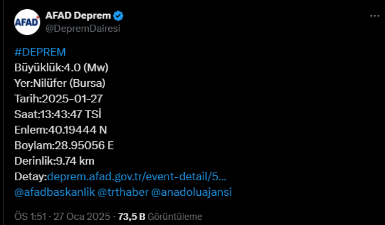 AFAD ve Kandilli'den son dakika Bursa açıklaması: Bursa'da deprem mi oldu? Bursa deprem listesi (27 Ocak 2025)