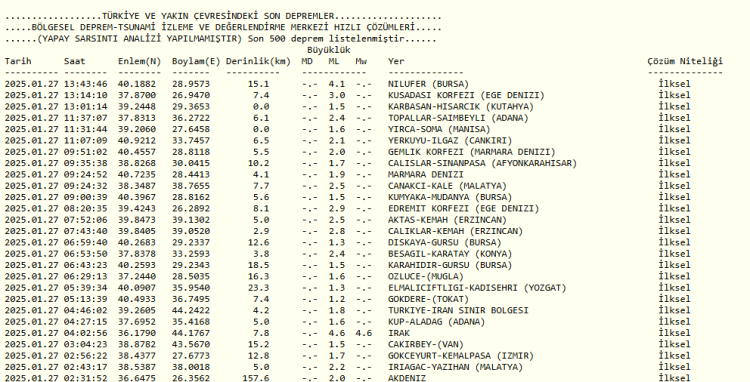 İŞTE BURSA'DAKİ SON DEPREMLERİN LİSTESİ... (27 Ocak 2025)