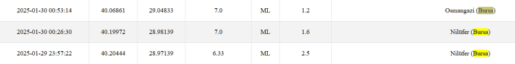 AFAD ise dün saat 23.57'deki depremin büyüklüğünü 2.5 olarak açıkladı. AFAD'ın verilerine göre saat 00.26'da Nilüfer'de 1.6 büyüklüğünde, saat 00.53'te Osmangazi'de 1.2 büyüklüğünde artçı kaydedildi.