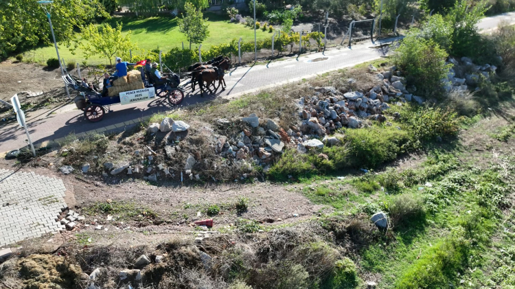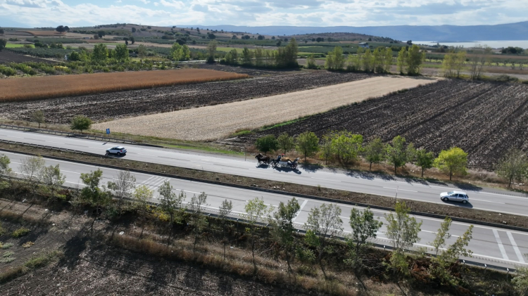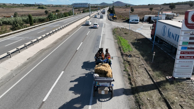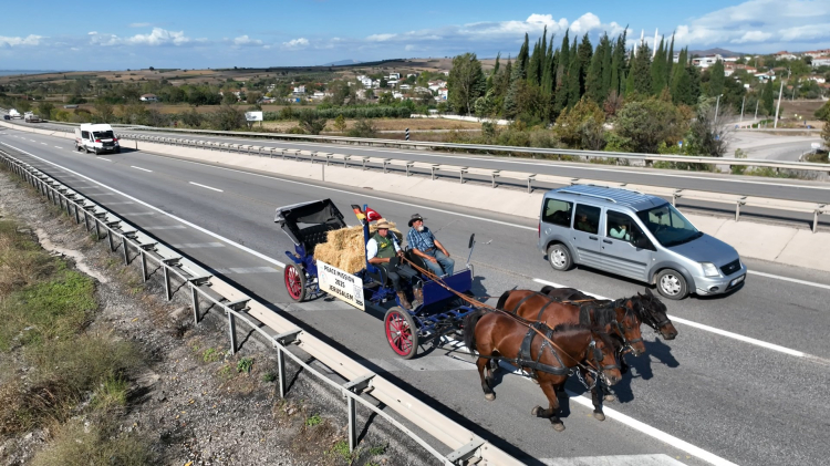 Türkiye'ye gelen aktivitler, Bursa'da mola verdi. Sabahın ilk ışıklarıyla yine yola koyulan ekip, at arabalarında yer alan ve İkinci Dünya Savaşı’ndan kalma askeri hurdadan dökülmüş çandaki 'Herkesle barışı kovalayın' yazısıyla dikkat çekiyor.