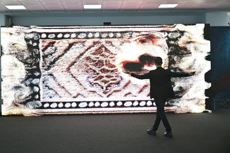 "Her dakika değişen bu desenler, kapalı bir bilgi kütüphanesinden faydalanarak dönemin mimari anlayışlarını, sanat eserlerini ve kültürel birikimini işliyor. Böylece ortaya çıkan motif, ilgili döneme referans veren bir yapıda oluyor. Ziyaretçiler, bu motiflerin karşısına geçtiğinde derinlik algılayıcılar tarafından tespit edilerek, motifleri adeta bir sıvı formu gibi hareket ettirebiliyor ve onun içinde gezinebiliyor. Yani burada tam anlamıyla bütüncül bir deneyim yaşanıyor."