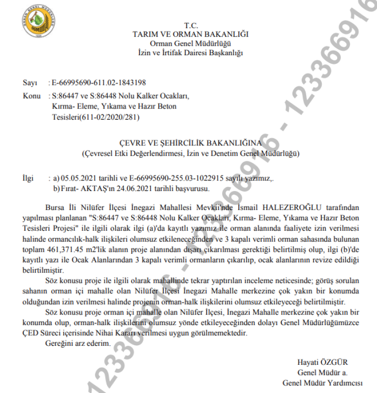 Bursa'nın Nilüfer ilçesine bağlı İnegazi köyünde çoğunluğu ormanlık bir kısmı ise tarım arazilerinden oluşan bölgede kalker ocakları ve kırma-eleme tesisi yapılması için yapılan başvuruya onay çıktı.