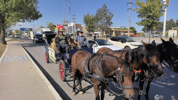 151 gündür yolda olan çiftçiler, üç atın çektiği arabalarıyla Bursa’nın İnegöl ilçesinden geçti. Yol boyunca çeşitli şehirlerde insanlarla buluşan ikili, barış ve dostluk mesajı veriyor.