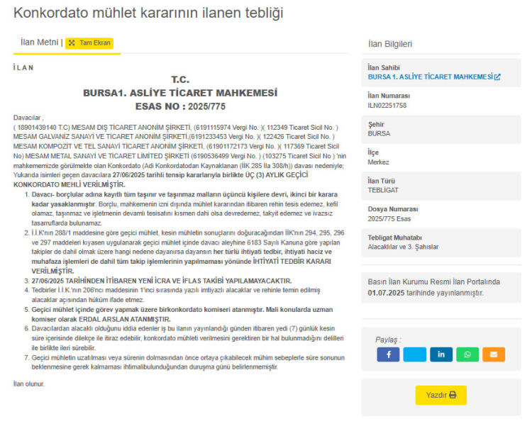 Firmaların başvurularını inceleyen mahkeme; Mesam Dış Ticaret Anonim Şirketi, Mesam Galvaniz Sanayi ve Ticaret Anonim Şirketi, Mesam Kompozit ve Tel Sanayi Ticaret Anonim Şirketi İle Mesam Metal Sanayi ve Ticaret Limited Şirketi'ne 3 aylık geçici konkordato mühleti tanıdı.