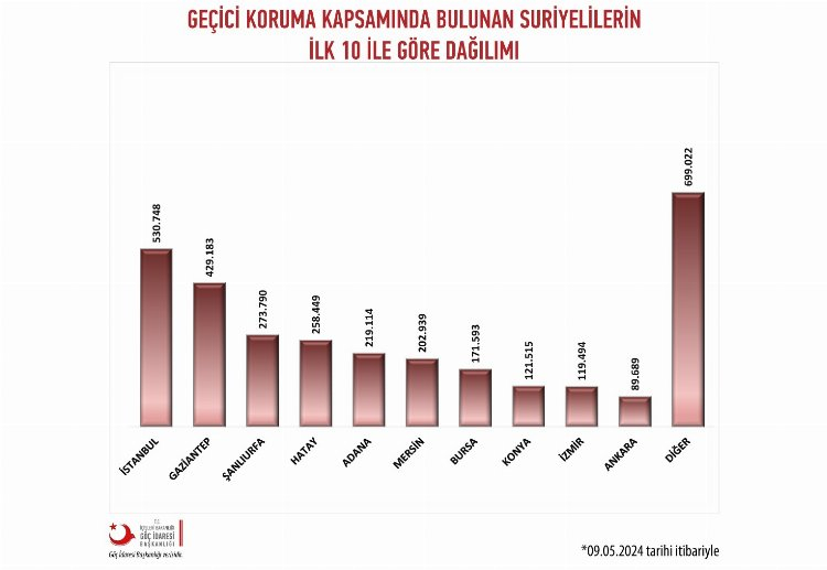İçişleri Bakanlığı Göç İdaresi Genel Müdürlüğü, 9 Mayıs itibarıyla Bursa'da geçici koruma statüsünde 171 bin 593 Suriyelinin olduğunu açıkladı.
