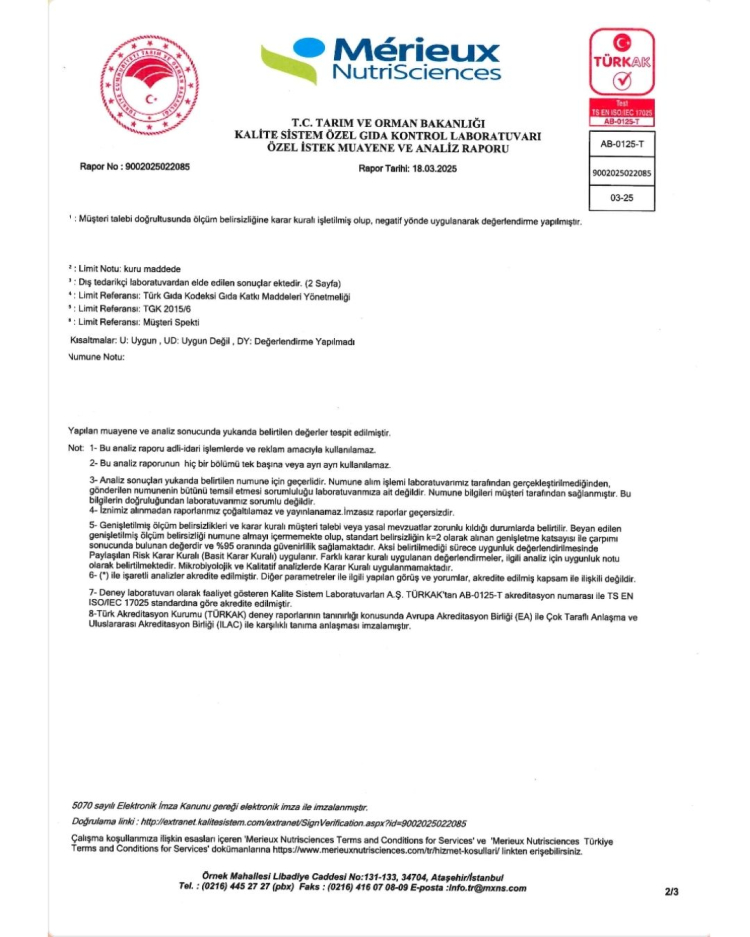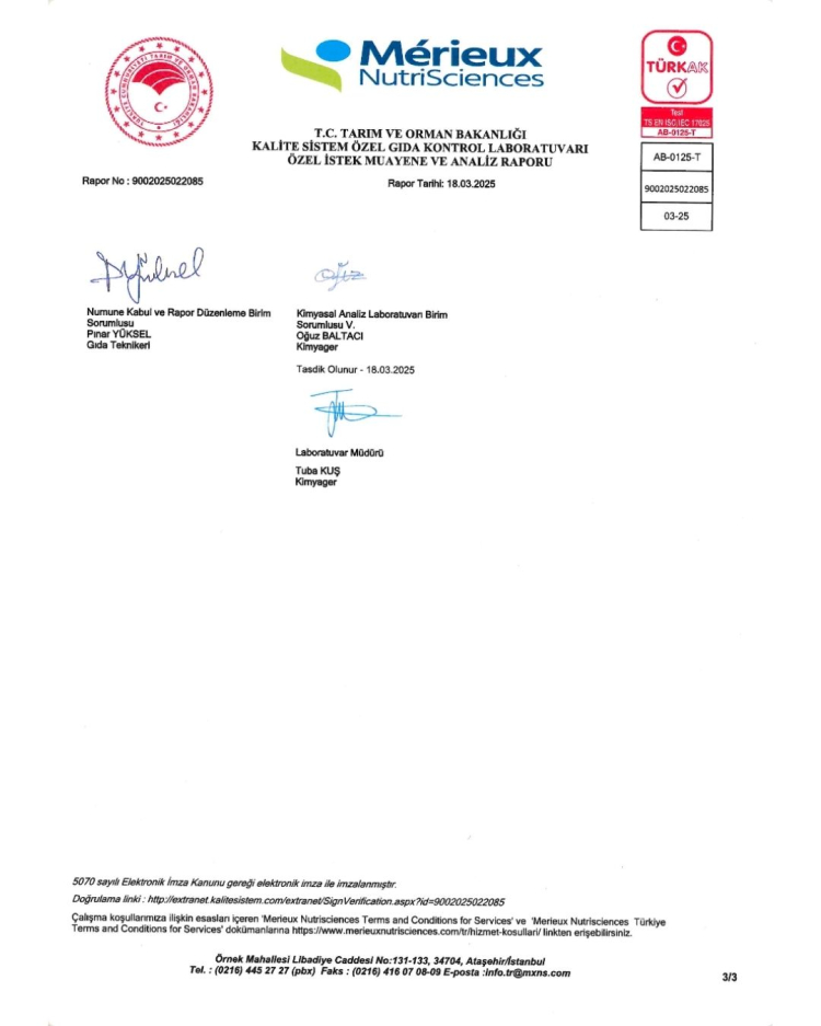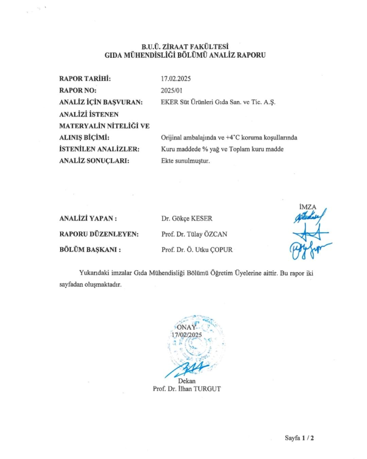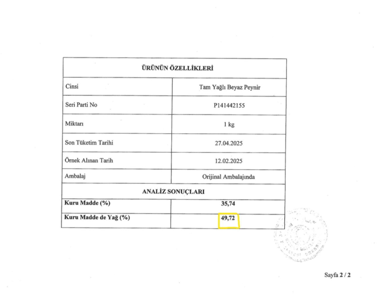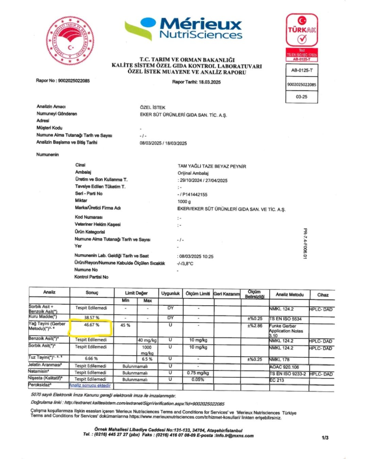 Aynı seri ve parti numarasına ait numuneler üzerinde farklı ve akredite laboratuvarlarda gerçekleştirilen yağ oranı analizlerinde dört ayrı olumlu sonuç elde edilmiştir. Bursa Gıda Araştırma Laboratuvarı, Uludağ Üniversitesi, Kalite Sistem Özel Gıda Kontrol Laboratuvarı ve Konya Gıda Araştırma Laboratuvarı tarafından yapılan analizlerde ürünün kuru maddede yağ oranının ilgili mevzuata uygun olduğu tespit edilmiştir.