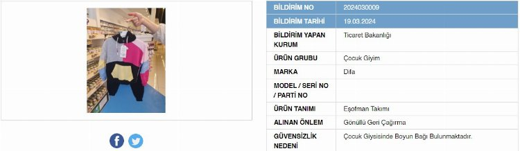 Söz konusu kararın, ürünün kapişon bağcık boyunun uygunsuz olması ve ürüne ait gri zemin için elyaf etiket bilgisi belirtilmediğinden dolayı alındığı belirtildi.