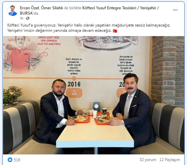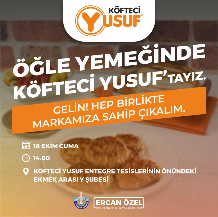 Sosyal medyadan duyuru yayımlayan Özel, "Köfteci Yusuf’u destekliyoruz. Biz şehrimizin markası olan Köfteci Yusuf’a da, ahlakından ve iş disiplininden ödün vermeyen Yusuf Akkaş’a da güveniyoruz… Yenişehirliler olarak, şehrimizin markasına destek olmak için Cuma günü (bugün) saat 14.00’da Köfteci Yusuf’ta olacağız. Gelin! Hep birlikte markamıza sahip çıkalım." ifadelerini kullandı.