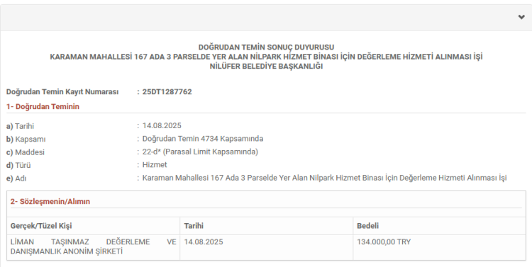 Belediye, Liman Taşınmaz Değerleme ve Danışmanlık Anonim Şirketi'ne değerleme hizmeti için 134 bin TL ödedi.