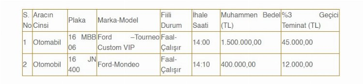 Mudanya Belediye Başkanlığı tarafından yapılan açıklamada, "Belediyemize ait araçlarımız 2886/45. maddesine göre açık teklif usulüyle satışa çıkarılmak üzere 14.06.2024 tarihinde, saat 14.00’da ihale edilecektir." denildi.