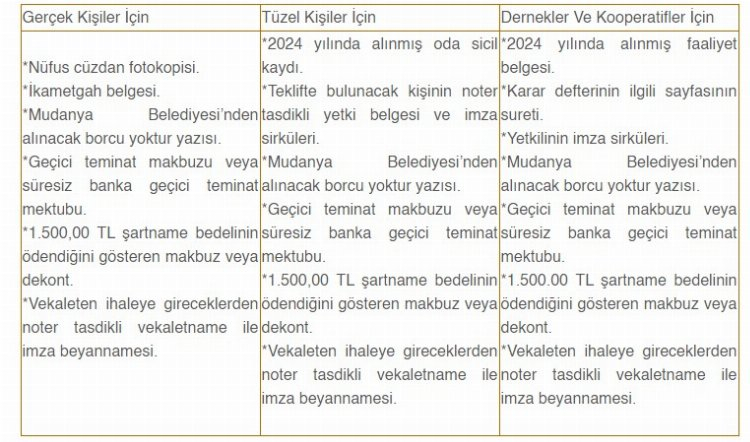 Belediye ihaleye katılacaklardan istediği belgeleri şu şekilde paylaştı: