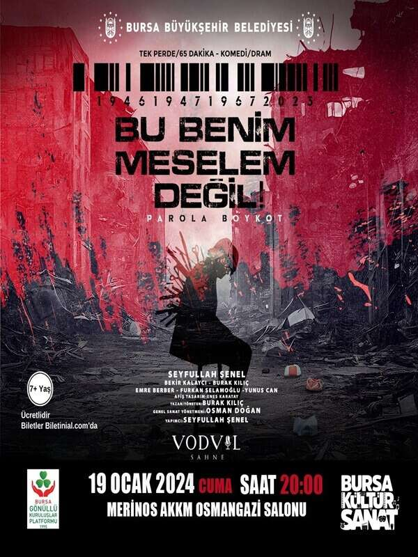 Yaşlı, kadın ve çocuk demeden Filistinli masum sivilleri katleden Siyonist İsrail ordusuna karşı başlatılan boykot hareketini ele alan "Bu Benim Meselem Değil! Parola Boykot" isimli tiyatro oyunu Bursa'da sahnelenecek.