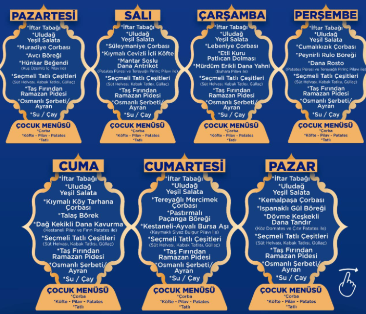 Kaliteli hizmet ve uygun fiyat politikasından taviz vermeyen BURFAŞ, bu RamazanDobruca, Merinos Park ve Mudanya'daki sosyal tesislerde iftar yemeği verecek. Atatepe Sosyal Tesisi ise yenileme çalışmaları nedeni ile kapalı olacak.