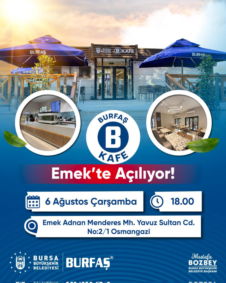 Bursa Büyükşehir Belediyesi iştiraklerinden BURFAŞ, şehrin sosyal yaşamını zenginleştiren yatırımlarına bir yenisini daha ekliyor. Yeni açılacak olan B Kafe, 6 Ağustos Çarşamba günü saat 18.00'de Osmangazi ilçesi Emek Adnan Menderes Mahallesi’nde hizmete giriyor. İşte detaylar...