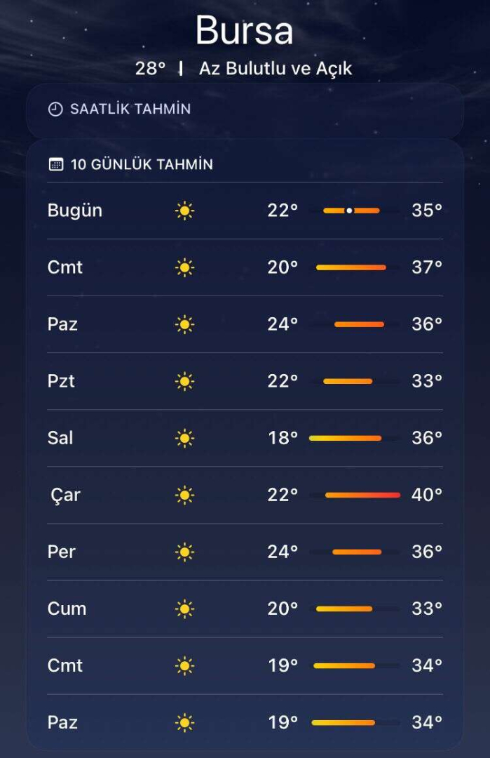 Buna göre, meteorolojik verilere bakıldığın özellikle önümüzdeki hafta içerisinde çarşamba günü Bursa genelinde termometrelerin 40 dereceye kadar yükselmesi bekleniyor.
