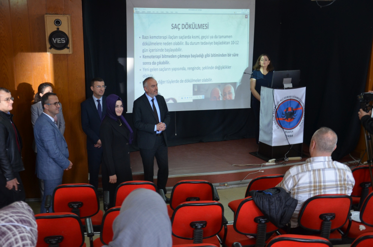 Törende konuşan Başhekim Uzm. Dr. Mehmet Akın, Onkoloji Hasta Okulu’nda tıbbi onkolog, hematolog, diyetisyen, psikolog gibi alanında uzman birçok sağlık profesyonelinin hasta ve hasta yakınlarına eğitim vereceğini belirtti. Kanserin tedavi edilmesi gereken bir hastalık olmasının yanında sosyal ve psikolojik yönleri de olduğunu vurgulayan Uzm. Dr. Akın, “Kanser, aileyi ve çevreyi de ilgilendiriyor. O duygusal süreçleri iyi yönetmek gerekiyor. Biz burada size sadece ders anlatmayacağız. Bu tedavi süresi boyunca da yoldaşlık edeceğiz, size destek olmaya çalışacağız. Çünkü özellikle kemoterapi tedavisi başlanan hastalarımızın; ‘Başıma neler gelecek? Günlük hayatım nasıl etkilenecek? Ne gibi yan etkilerle karşılaşacağım?' gibi birçok soru kafalarını meşgul ediyor. Bizim amacımız da bu derslerde doğru ve güvenilir bilgileri sunarak, onlara bu süreçte karşılaşacakları ufak tefek problemlerle, yan etkilerle nasıl daha doğru bir şekilde başa çıkabileceklerini anlatmak, göstermek. Gerçekten çok ufak müdahalelerle bu yan etkiler atlatılabiliyor ve gereksiz yere tedavilerimiz yarım kalmamış oluyor” dedi.