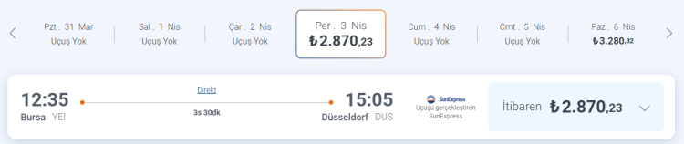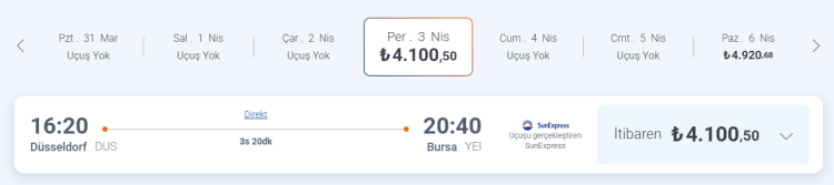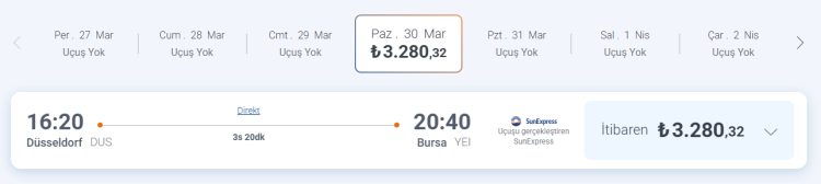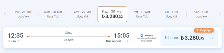 30 Mart günü saat 16:20'de Düsselford'tan Bursa yönüne hareket edecek uçağın bilet fiyatı da 3 bin 280 TL olarak belirlendi.