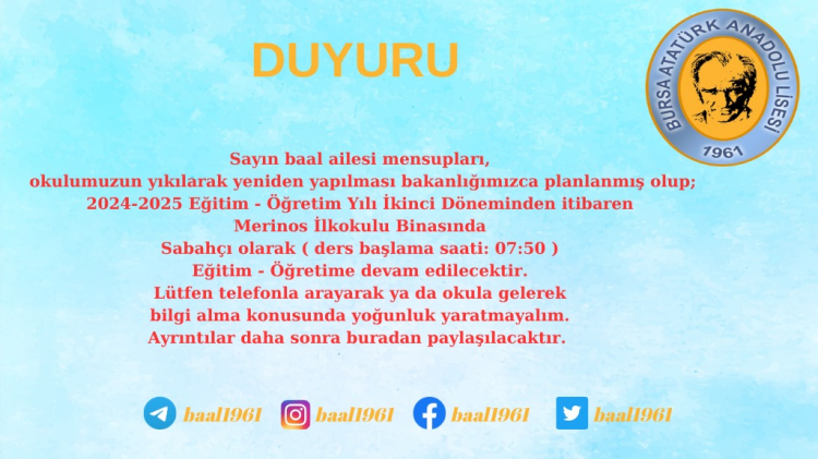 Sayın BAAL ailesi mensupları, okulumuzun yıkılarak yeniden yapılması bakanlığımızca planlanmış olup; 2024-2025 Eğitim - Öğretim Yılı İkinci Döneminden itibaren Merinos İlkokulu Binasında Sabahçı olarak (ders başlama saati: 07:50 ) Eğitim - Öğretime devam edilecektir. Lütfen telefonla arayarak ya da okula gelerek bilgi alma konusunda yoğunluk yaratmayalım. Ayrıntılar daha sonra buradan paylaşılacaktır.
