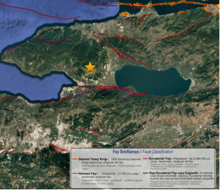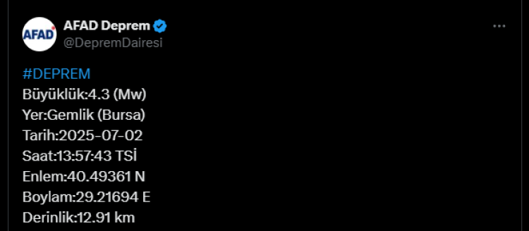 Afet ve Acil Durum Yönetimi Başkanlığı (AFAD), saat 13.57'de Gemlik Şahinyurdu'nda 4.3 büyüklüğünde deprem olduğunu duyurdu.