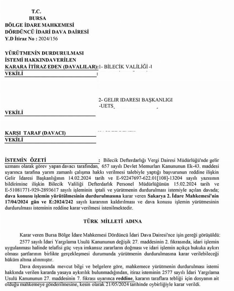 Gelir İdaresi başkanlığında yaşanan bir olayda, memur anne, 657 sayılı Kanunun ek 43. madde hükmüne dayanarak yarı zamanlı çalışma talep etmiş ancak bu talebi Gelir İdaresi Başkanlığının 14.02.2024 tarih ve 13204 sayılı yazıyla reddedilmiştir. Red yazısının iptali istemiyle açılan davada Sakarya 2. İdare Mahkemesi, Bilecik Valiliğinin işlemini iptal etmiş bu karar da Bursa Bölge İdare Mahkemesi 2024/156 nolu kararıyla onanmıştır." ifadelerine yer verildi.