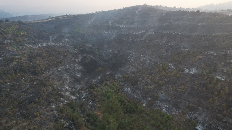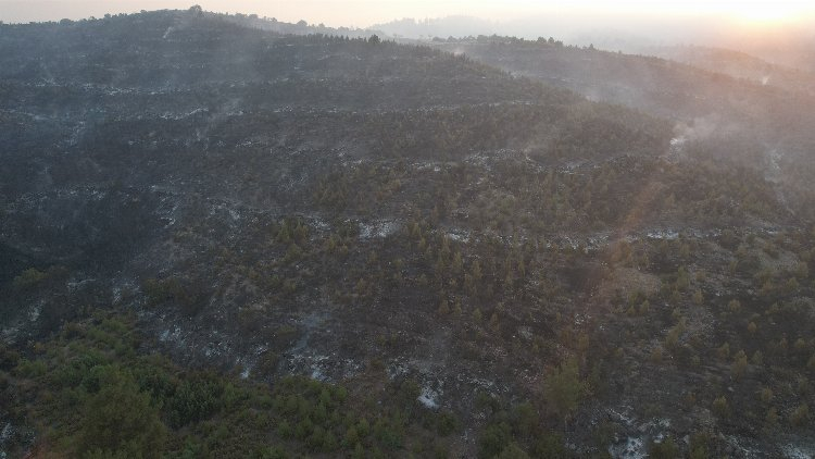 Bursa'nın Büyükorhan ilçesinde ormanlık alanda çıkan yangın günün ilk ışıklarında dron ile havadan görüntülendi. Bin personelin havadan ve karadan müdahalesi sürerken, yangın kısmen kontrol altına alındı.