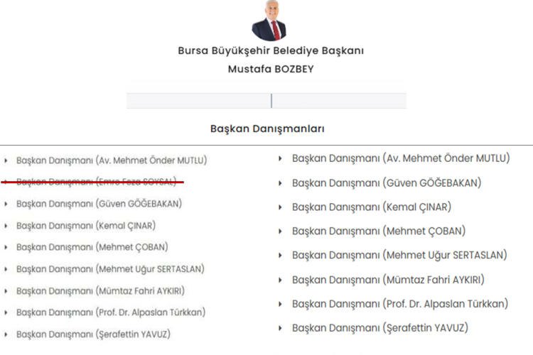 Bursa Büyükşehir Belediyesi'nin resmi internet sitesinde yer alan Başkan Danışmanları listesinden Emre Feza Soysal'ın ismi silindi.
