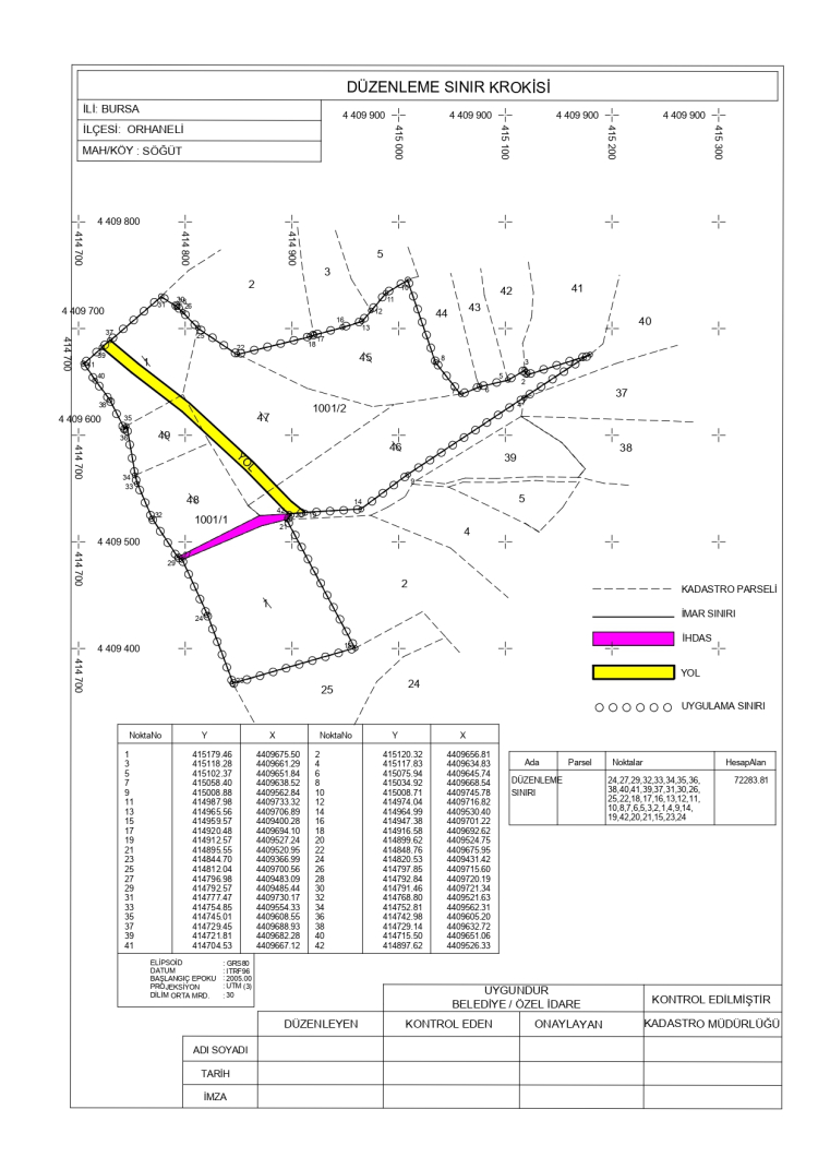 Encümenin 21 Aralık 2025 tarihli ve 2025/16252 sayılı kararıyla; UİP-161113465 plan işlem numaralı, 2025/113 kurum dosya numaralı 1/1000 Ölçekli Uygulama İmar Planı kapsamında Orhaneli ilçesi Söğüt Mahallesi’nde 147 ada 1 parsel ile 148 ada 1, 45, 46, 47, 48 ve 49 parseller için düzenleme yapıldı.