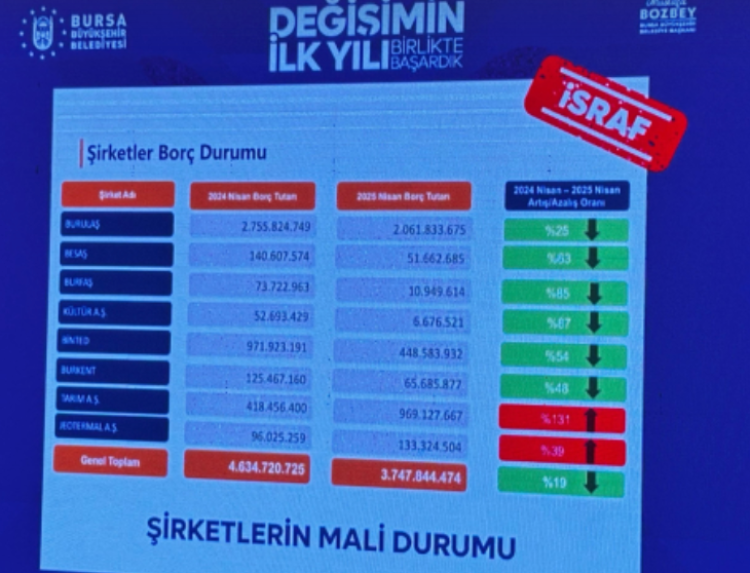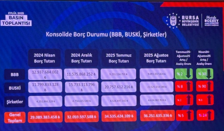 Nisan 2024, Aralık 2024 ve Temmuz 2025 ve Ağustos 2025 borçlarını kıyaslandığı tabloda, Büyükşehir Belediyesi'nin Nisan 2024-Ağustos 2025 artış/azalış tablosunda yüzde 30'luk bir düşüş gerçekleştiği kaydedilmişti.