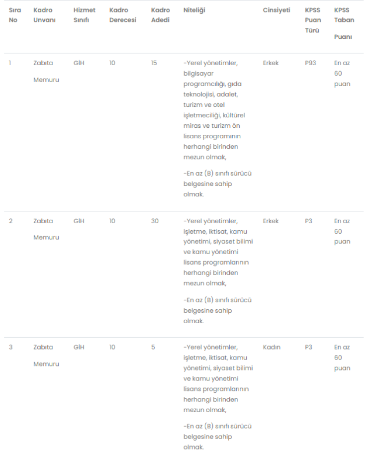 İlan edilen kadrolar için, mezun olunan okul itibarıyla öğrenim şartını taşımak ve bu öğrenimle ilgili olarak 2024 yılı Kamu Personel Seçme Sınavından (KPSS) alım yapılacak kadroların karsısındaki puan türünden, belirtilen asgari KPSS puanını almış olmak,657 sayılı Devlet Memurları Kanununun 48 inci maddesinin (A) fıkrasında belirtilen genel şartların yanı sıra Belediye Zabıta Yönetmeliğinin 13/A maddesinde yer alan özel şartlara göre, zabıta memuru kadrolarına başvuru yapılabilmesi için; tartılma ve ölçülme aç karnına, soyunuk ve çıplak ayakla olmak kaydıyla erkeklerde en az 1.67 metre, kadınlarda en az 1.60 metre boyunda olmak ve boyun 1 metreden fazla olan kısmı ile kilosu arasında (+,-) 10 kg’dan fazla fark olmamak (Boy ve kilo tespitleri Belediyemizce başvuru sırasında yapılacaktır)Sınavın yapıldığı tarihte 30 yaşını doldurmamış olmak,13.10.1983 tarihli ve 2918 sayılı Karayolları Trafik Kanunu hükümlerince verilen ve tablonun nitelik kısmında belirtilen en az (B) sınıfı sürücü belgesine sahip olmak,