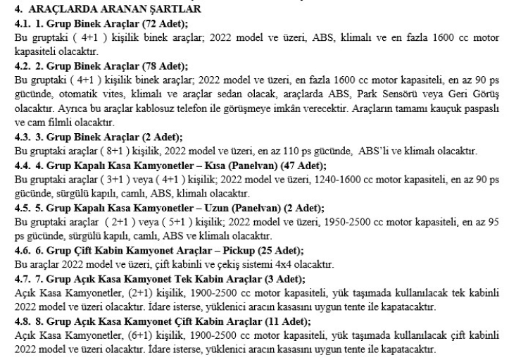 1. gruptaki 72 adet binek aracın ABS, klimalı ve en fazla 1600 cc motor kapasiteli; 2. gruptaki 78 adet binek aracın en fazla 1600 cc motor kapasiteli, en az 90 ps gücünde, otomatik vites, klimalı ve araçlar sedan olması gerektiği ifade edildi. 2. gruptaki araçların ABS, park sensörü, geri görüş kamerası, kablosuz telefon ile görüşme özellikleri olması istendi. Ayrıca araçların tamamının kauçuk paspaslı ve cam filmli olması gerekiyor.