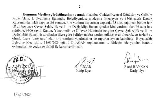 İstanbul Caddesi Kentsel Dönüşüm ve Gelişim Proje Alanında yürütülen çalışmalarda Bursa Büyükşehir Belediyesi ile sözleşme imzalayan hak sahiplerinden kira yardım süresi dolan hak sahiplerine Çevre, Şehircilik ve İklim Değişikliği Bakanlığı tarafından illere göre belirlenen kira yardım miktarı baz alınarak kira yardımının devam etmesi kararı alındı.