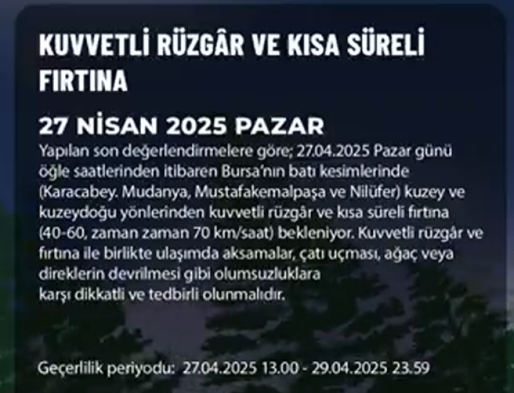 Yapılan son değerlendirmelere göre; 27.04.2025 Pazar günü öğle saatlerinden itibaren Bursa'nın batı kesimlerinde (Karacabey. Mudanya, Mustafakemalpaşa ve Nilüfer) kuzey ve kuzeydoğu yönlerinden kuvvetli rüzgâr ve kısa süreli firtina (40-60, zaman zaman 70 km/saat) bekleniyor. Kuvvetli rüzgâr ve fırtına ile birlikte ulaşımda aksamalar, çatı uçması, ağaç veya direklerin devrilmesi gibi olumsuzluklara