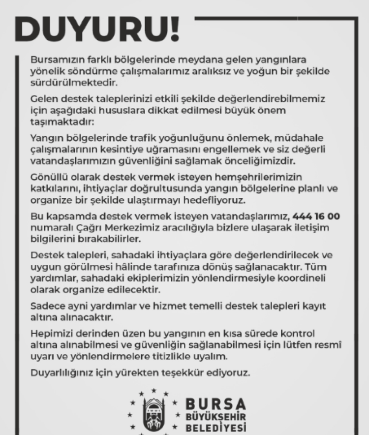 Destek vermek isteyen gönüllülerin katkılarının planlı ve organize bir şekilde yangın bölgelerine ulaştırılacağı belirtilirken, bu süreçte sadece araç-gereç ve hizmet temelli destek taleplerinin değerlendirileceği ifade edildi. Yardımda bulunmak isteyenlerin, 444 16 00 numaralı Çağrı Merkezi üzerinden iletişim bilgilerini bırakabilecekleri açıklandı.