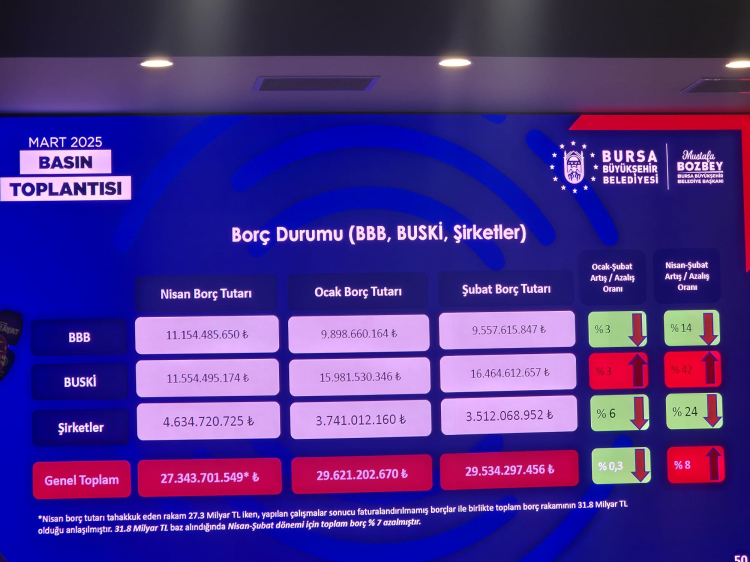 Büyükşehir Belediyesi'nin Nisan ayındanŞubat ayınakadar yüzde 14, şirketlerin ise yüzde 24 oranında borcu azaldı. BUSKİ'nin borcu ise Nisan - Şubat arasında yüzde 42 oranında arttı.