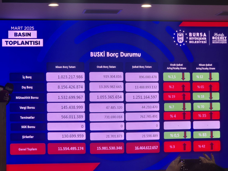Büyükşehir Belediyesi'nin Nisan ayından Şubat ayına kadar yüzde 14, şirketlerin ise yüzde 24 oranında borcu azaldı. BUSKİ'nin borcu ise Nisan - Şubat arasında yüzde 42 oranında arttı.