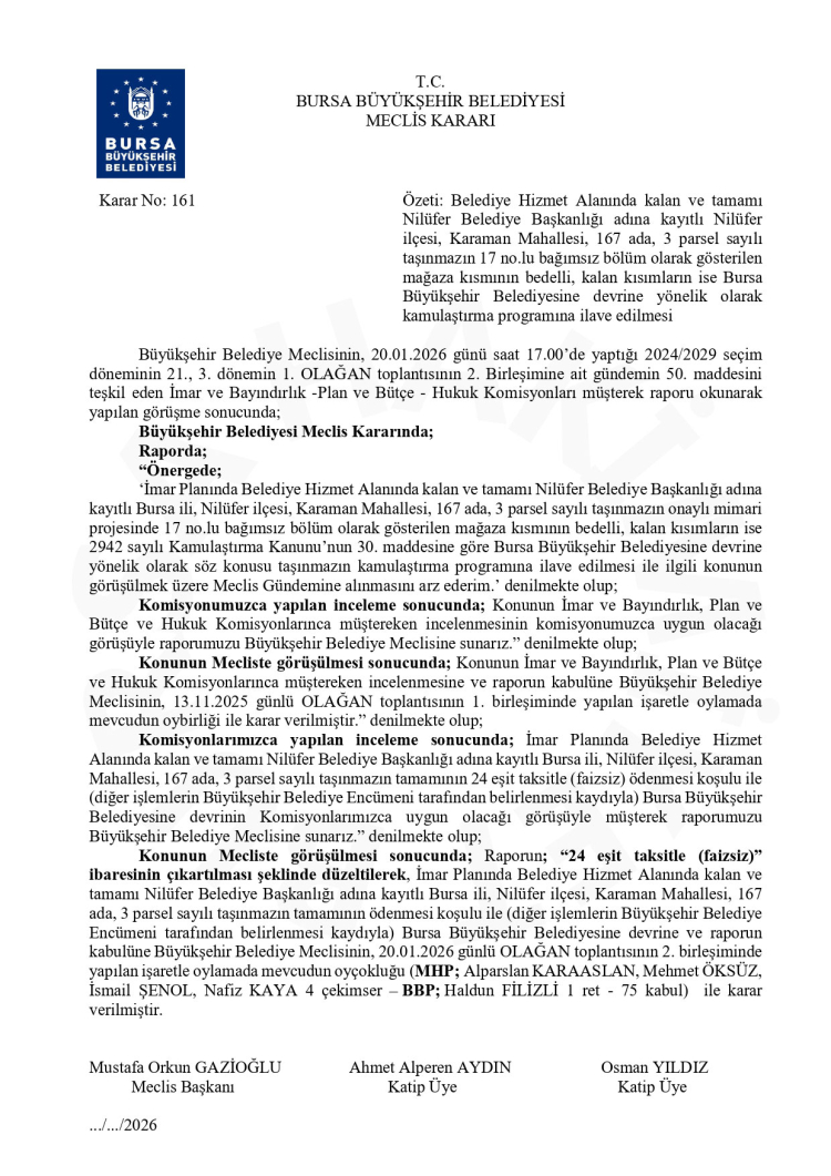 İmar planında belediye hizmet alanında kalan ve tamamı Nilüfer Belediye Başkanlığı adına kayıtlı taşınmazın tamamının 24 eşit taksitle (faizsiz) ödenmesi koşulu ile (diğer işlemlerin Büyükşehir Belediye Encümeni tarafından belirlenmesi kaydıyla) Bursa Büyükşehir Belediyesine devri için sunulan rapordaki "24 eşit taksitle (faizsiz)" ibaresi çıkartılarak kabul edildi.