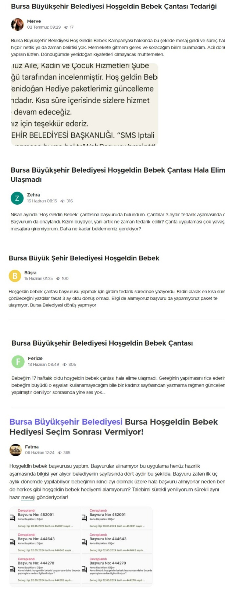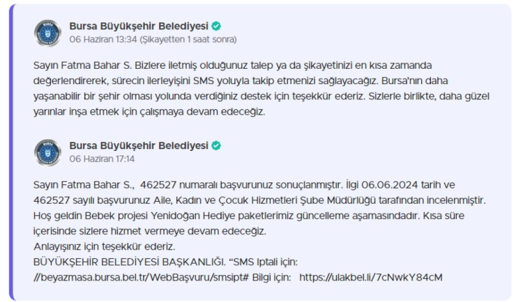 Şikayetvar üzerinden aylardır Hoşgeldin Bebek Paketini almadığını ifade eden bir anneye, Bursa Büyükşehir yetkilileri şu cevabı verdi: