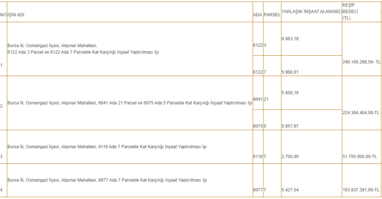 Büyükşehir Belediyesi, geçtiğimiz ay da Osmangazi ilçesine bağlı Altınova mahallesindeki kentsel dönüşüm alanında 2 parsel için 4 milyar TL'lik kat karşılığı inşaat ihale açmıştı.