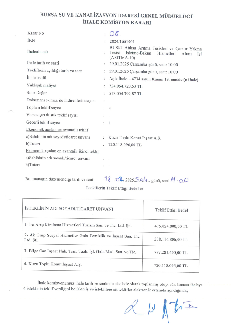 Bursa Büyükşehir Belediye Başkanlığına bağlı Bursa Su ve Kanalizasyon İdaresi Genel Müdürlüğü'nün (BUSKİ) atıksu arıtma ve çamur yakma tesislerinin işletme ve bakımı için açılan ihale sonuçlandı.