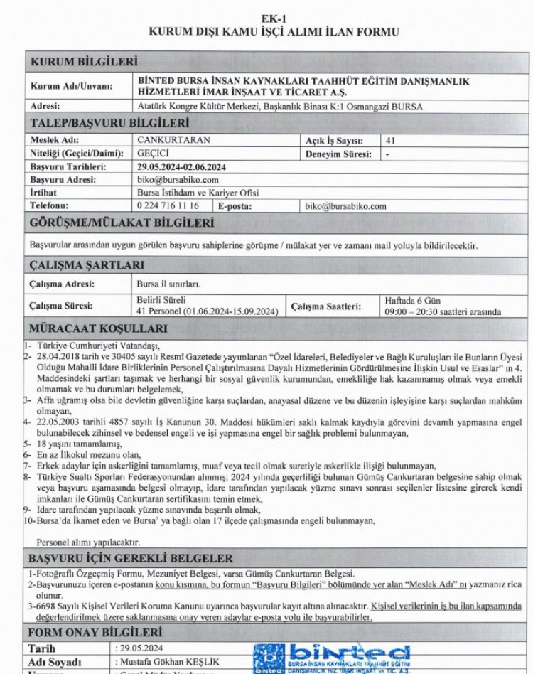İŞKUR üzerinden yayınlanan ilanda, Bursa sınırları içerisinde haftada 6 gün saat 09:00 - 20:30 aralığında geçici olarak çalışacak 41 cankurtaran alınacağı duyuruldu.