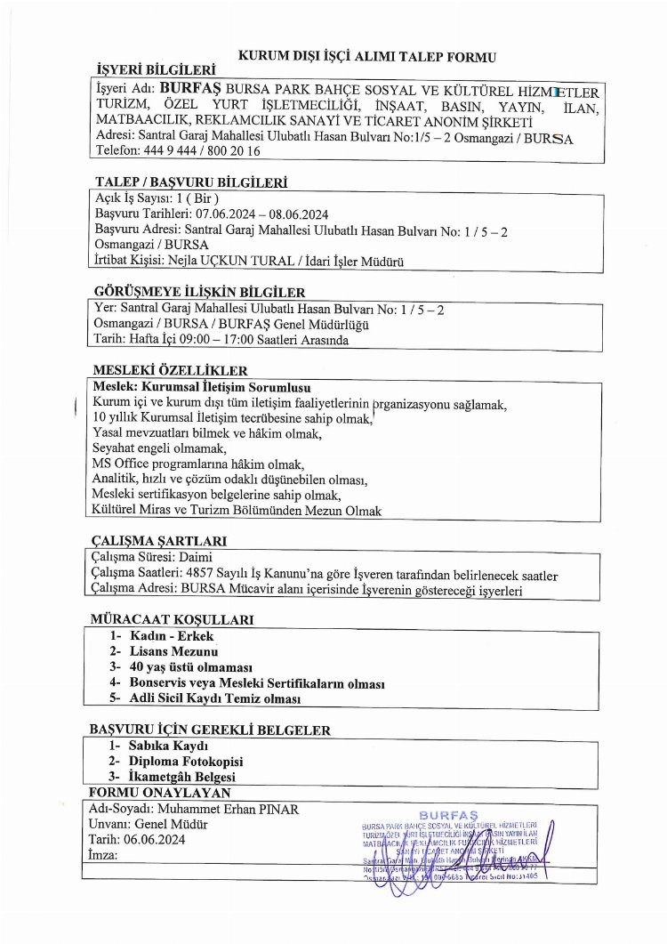 Bursa Büyükşehir Belediyesi'ne bağlı BURFAŞ, KPSS şartsız Kurumsal İletişim Sorumlusu alımı yapacağını duyurdu. İş ilanına başvuracak adayların Kültürel Miras ve Turizm bölüm olması gerektiği belirtildi. İşte detaylar...