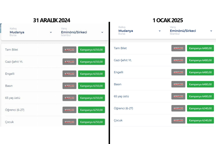 Öğrenci-çocuk biletleri ise 250 TL'den 340 TL'ye yükseldi.