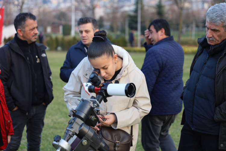 Bursa Büyükşehir Belediyesi tarafından düzenlenen ‘Gökyüzü Gözlem Şenliği'nde Güneş’i, gezegenleri ve Ay'ı profesyonel teleskoplarla gözlemleyen bilim tutkunları, bilim dolu bir akşam yaşadı.