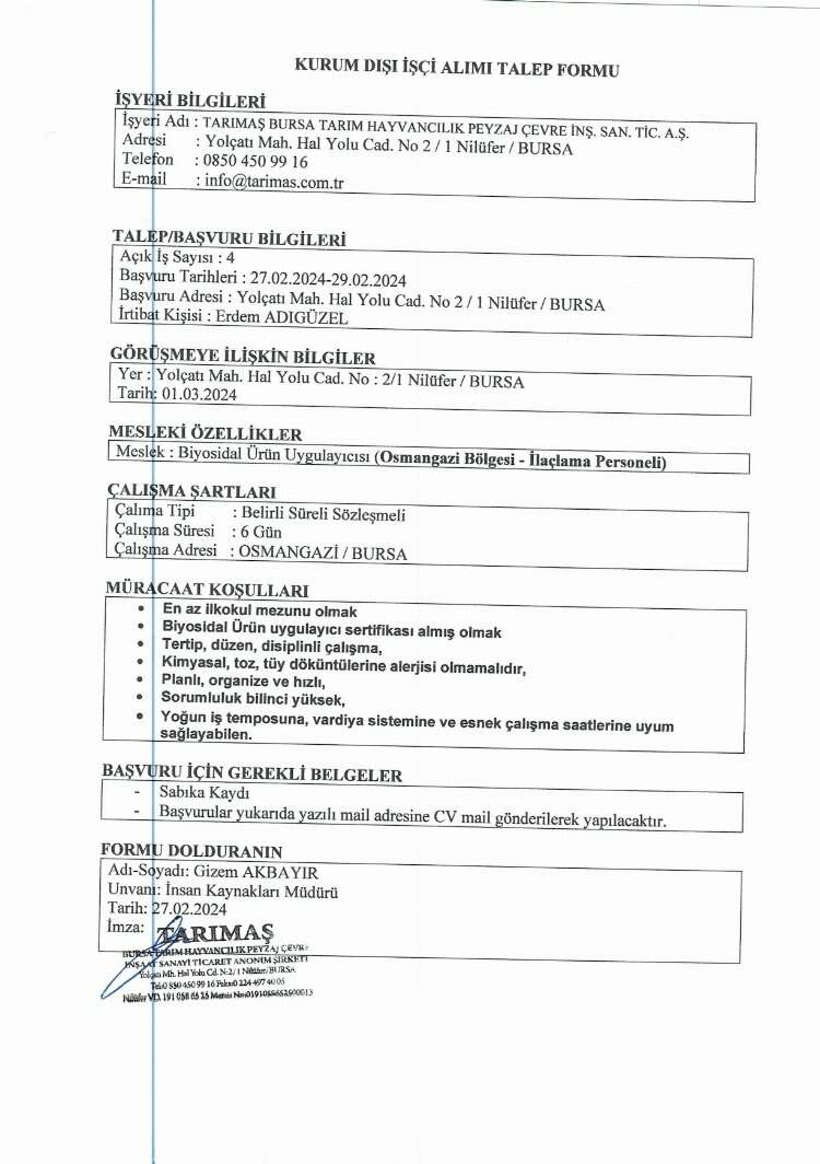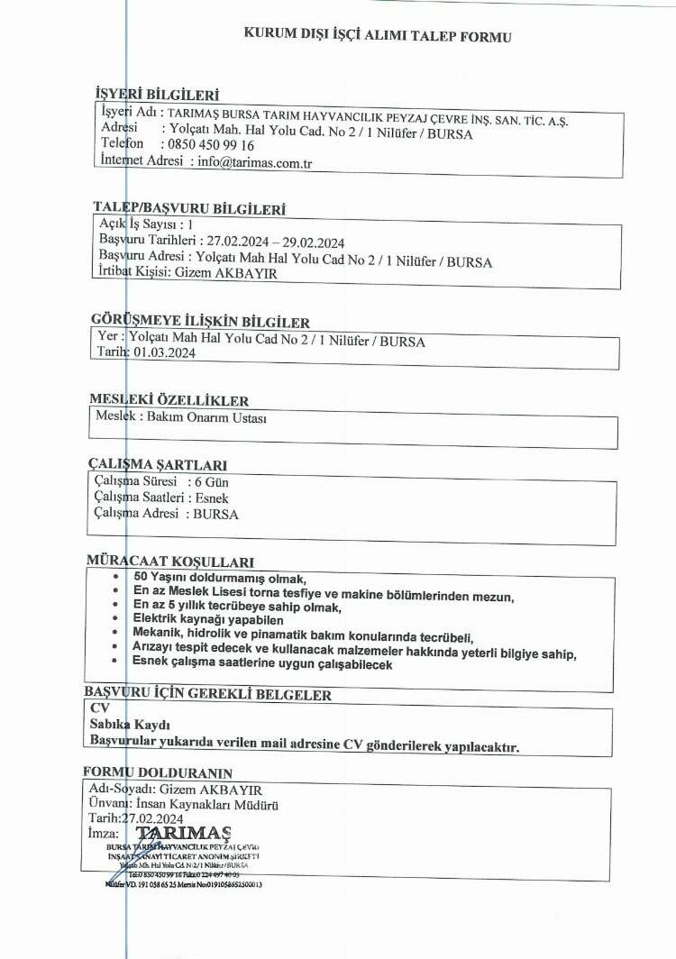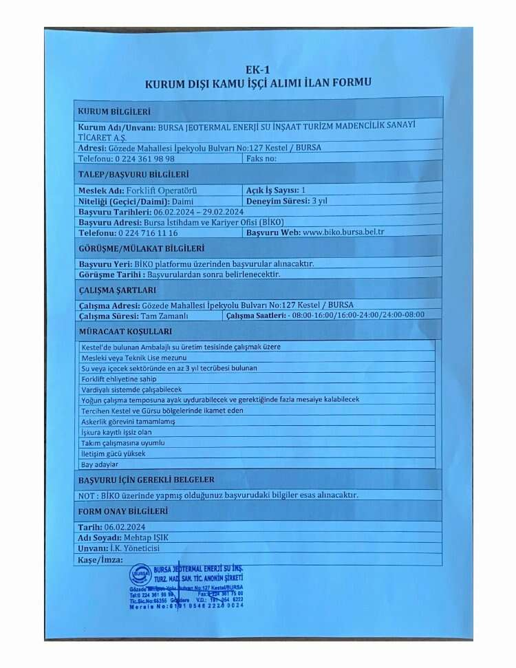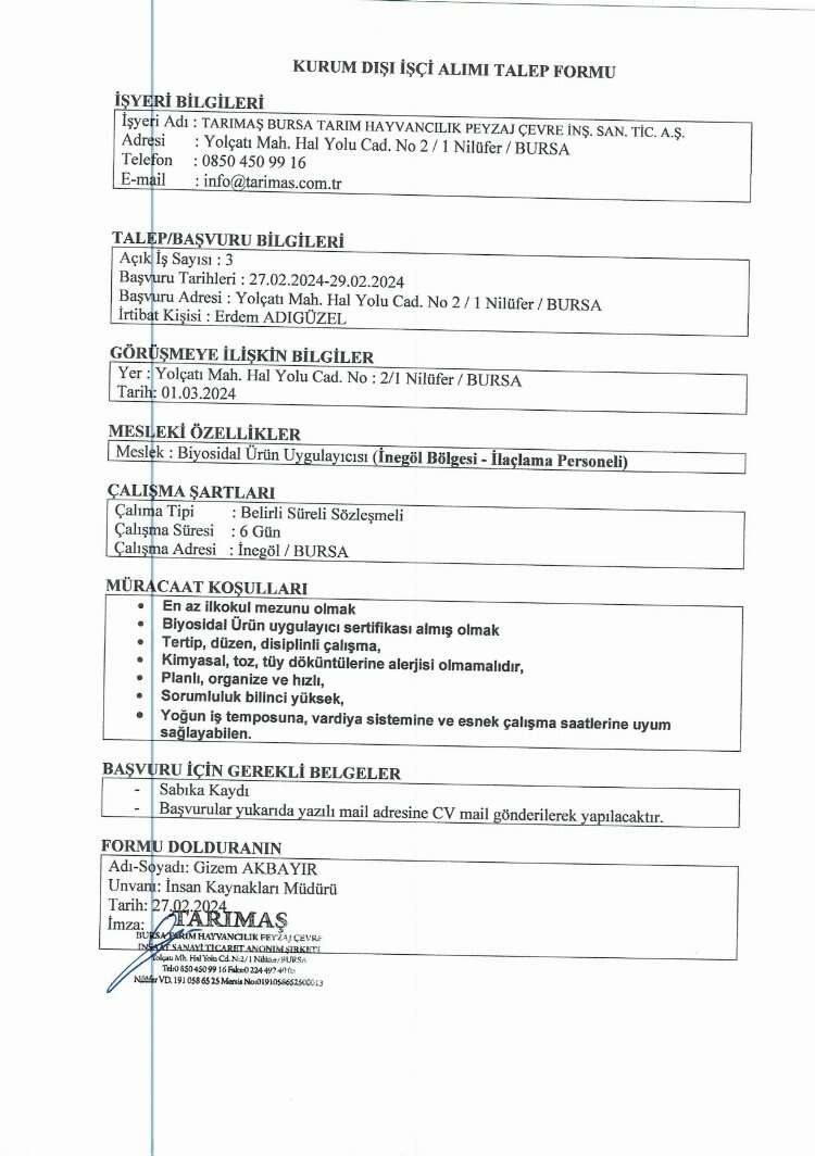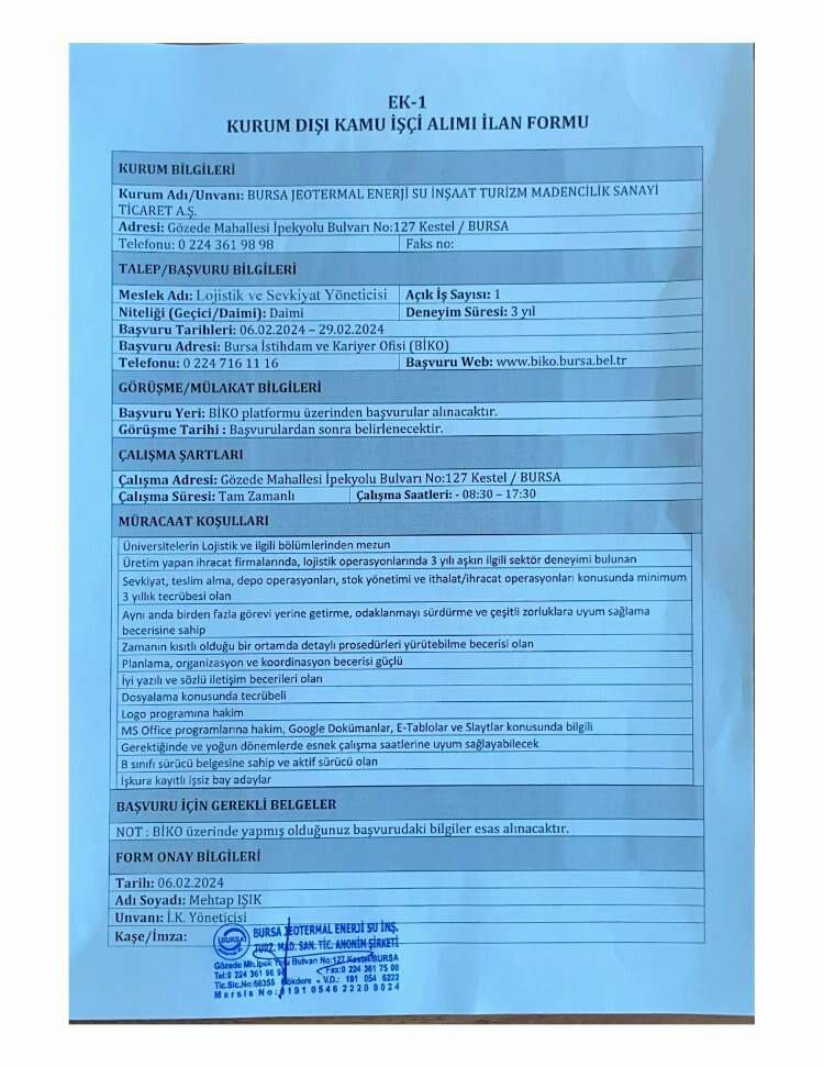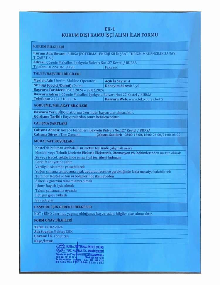 İŞKUR üzerinden ilan yayımlayan Tarım AŞ, 6 Güvenlik Görevlisi, 19 Biyosidal Ürün Uygulayıcısı ve 1 Bakım Onarım Ustası; Bursa Jeotermal A.Ş ise 1 Lojistik ve Sevkiyat Yöneticisi, 1 Forklift Operatörü ve 4 Üretim Makine Operatörü alacak.