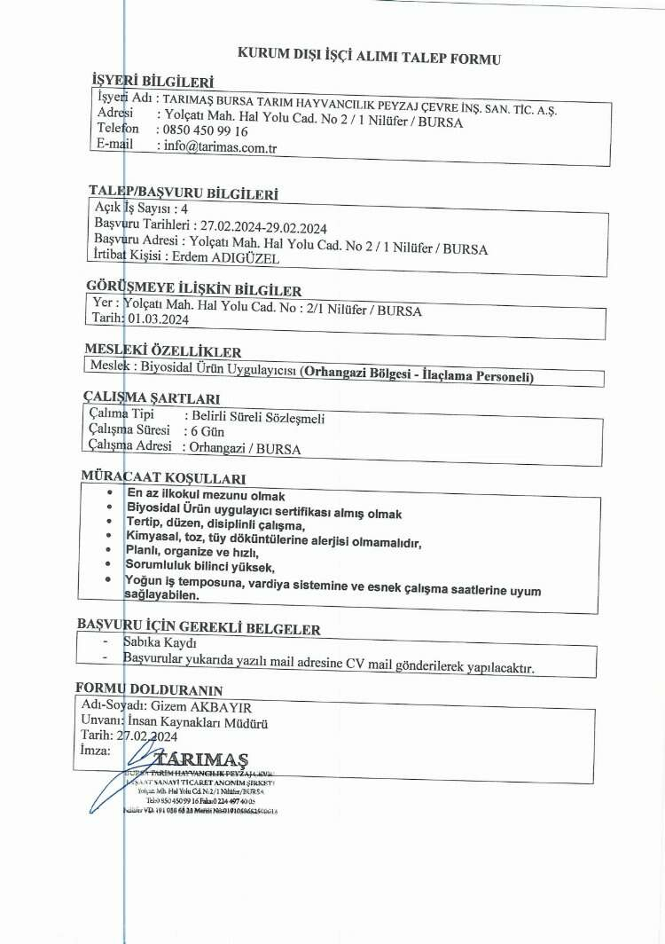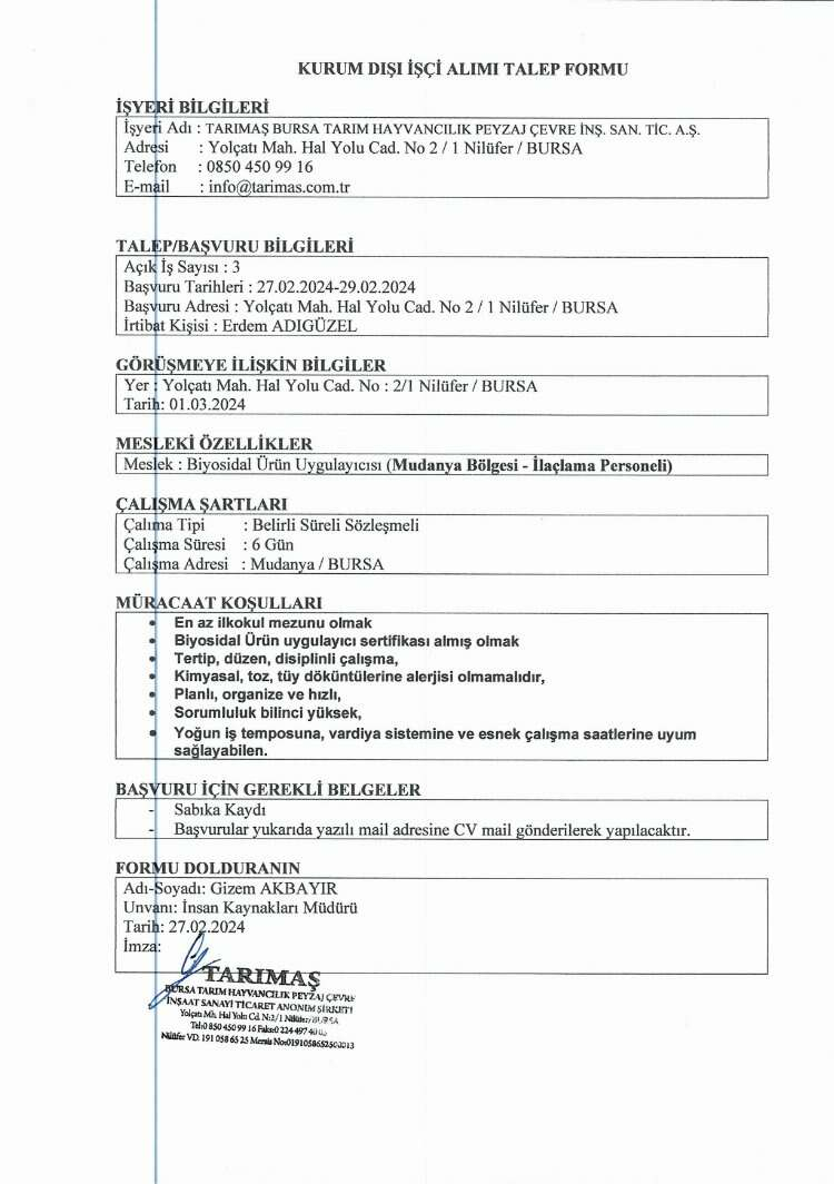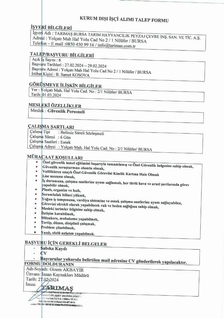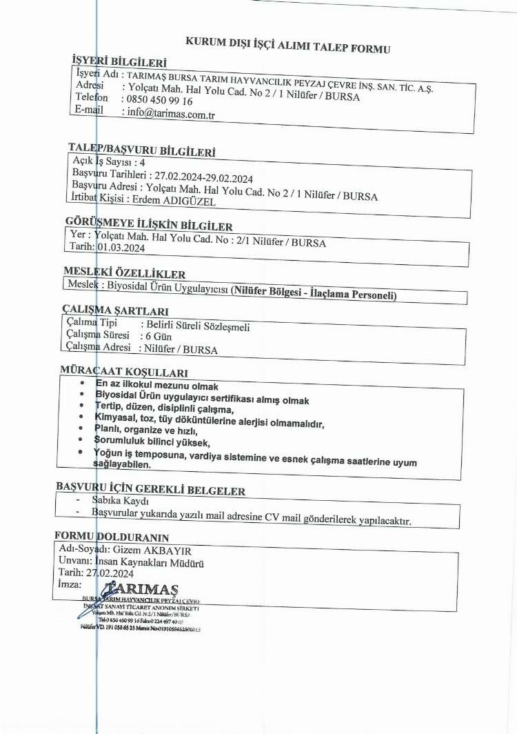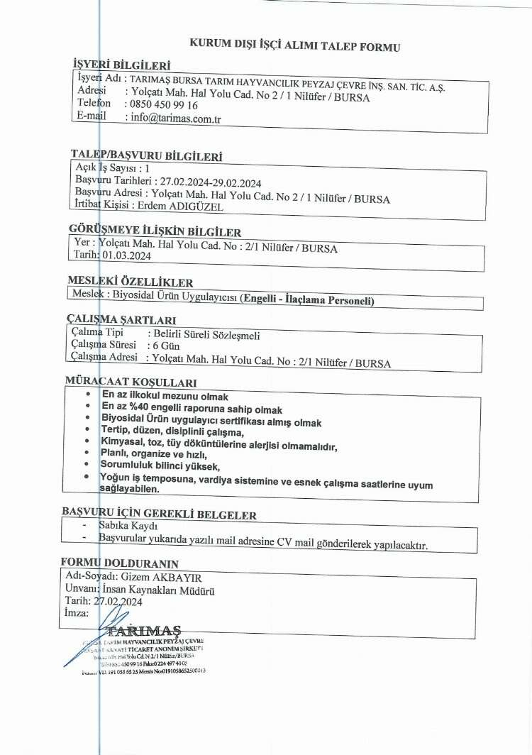 İŞKUR üzerinden ilan yayımlayan Tarım AŞ, 6 Güvenlik Görevlisi, 19 Biyosidal Ürün Uygulayıcısı ve 1 Bakım Onarım Ustası; Bursa Jeotermal A.Ş ise 1 Lojistik ve Sevkiyat Yöneticisi, 1 Forklift Operatörü ve 4 Üretim Makine Operatörü alacak.